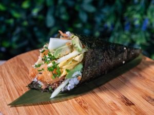 Salmão, Spicy, Abacate, Rúcula, Sésamo, e Cebolinho Salmon, Spicy, Avocado, Argula, Sesame ...